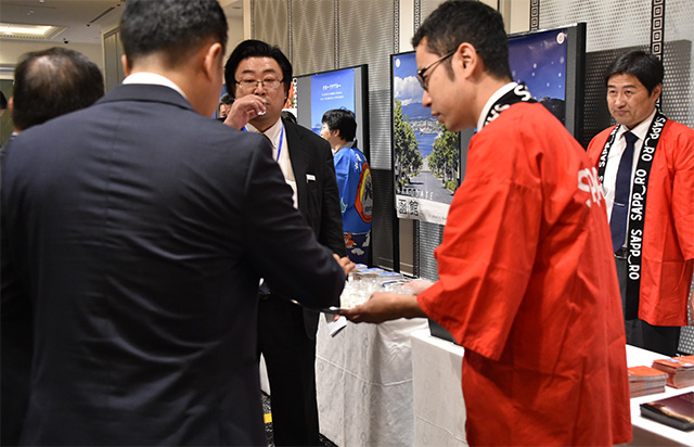 「“でかけよう北海道”の集い」に出展する函館市のブースと、試飲の日本酒を振る舞う札幌市のブース=18年10月15日 PHOTO: Yusuke KOHASE/Aviation Wire
