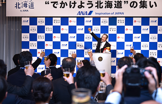 全日本空輸(ANA/NH)などANAグループは10月15日、「平成30年北海道胆振東部地震」からの復興支援の一環として「“でかけよう北海道”の集い」を都内のホテルで開催した。当日は北海道選出の衆議院議員や東京地区の旅行関係者など、およそ250人が参加。道内の7自治体がブースを出展して、観光をピーアールした。