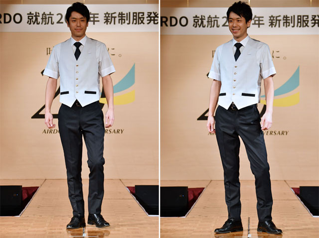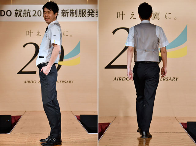 エア・ドゥ客室乗務員男性用新制服のベストスタイル=18年10月23日 PHOTO: Tadayuki YOSHIKAWA/Aviation Wire