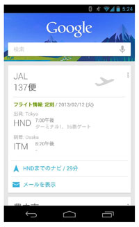 Google Nowはカレンダーの予定や、訪問先の場所に合わせた出発時間と交通情報など、ユーザーに最適な情報をユーザーが必要とするタイミングで知らせる機能。同サービスではJALの国際線と国内線の便名や出発・到着空港や時刻を「フライト情報カード」に表示する。