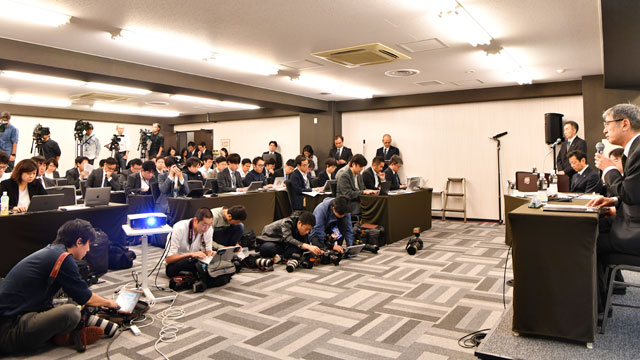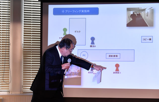 パイロットの飲酒について説明するJALの赤坂社長(右)=18年11月16日 PHOTO: Tadayuki YOSHIKAWA/Aviation Wire