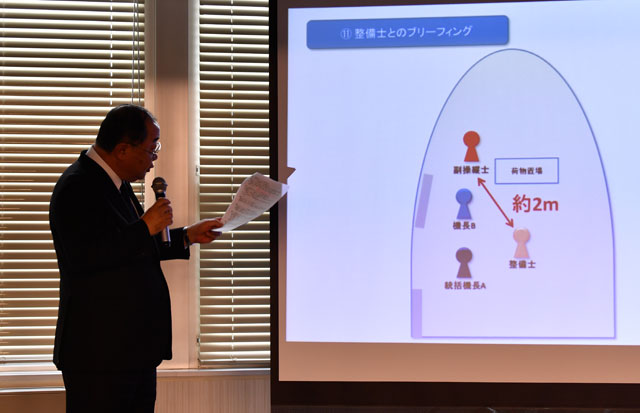 進専務は、「バスの車内では、副操縦士と運転手の距離は約60センチ、機長とは約180センチだった」とホテルからJALの事務所へ向かう際の送迎バス車内での位置関係を説明した。