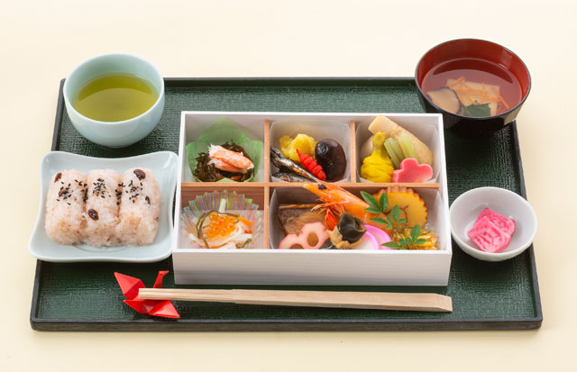 対象は、羽田を午後4時59分までに出発する札幌、伊丹、福岡、那覇行きの便のファーストクラス。おせち料理の定番、田作り、紅白なますなどをはじめ、紅ズワイガニやエビなどを使用した新春特別メニューで、俵ご飯には赤飯、椀物には雑煮を用意する。