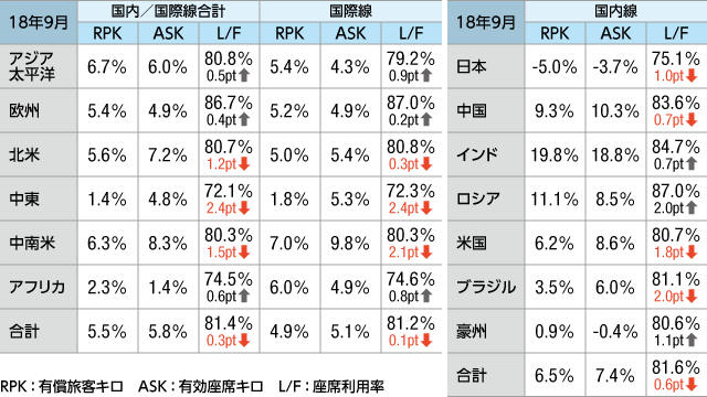 IATA(国際航空運送協会)の2018年9月の世界旅客輸送実績は、国際線と国内線の合計で、有償旅客の輸送距離を示すRPK(有償旅客キロ)は前年同月比5.5%増、座席供給量を示すASK(有効座席キロ)は5.8%増だった。ロードファクター(座席利用率、L/F)は0.3ポイント低下し81.4%だった。