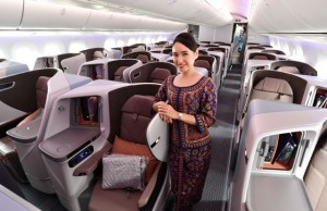 787-10ビジネスクラスを紹介するシンガポール航空の客室乗務員=PHOTO: Tadayuki YOSHIKAWA/Aviation Wire