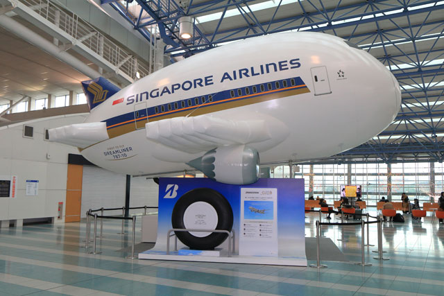 福岡空港に飾られたシンガポール航空の787-10のバルーンとタイヤ=18年12月9日 PHOTO: Youichi KOKUBO/Aviation Wire