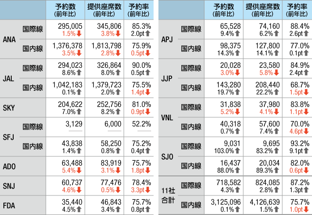 11社の発表値を合計すると、予約数は国際線が前年同期比4.3%増の71万8582人で、国内線は0.1%増の312万5096人。提供座席数は国際線が2.8%増の82万4085席で、国内線は1.5%増の412万6639席となった。11社平均の予約率は国際線が1.3ポイント上昇し87.2%、国内線は1.0ポイント低下し75.7%となっている。