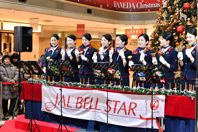 JALでは毎年、ベルスターによるミュージックベル演奏を年末に各地で披露している。結成は1995年で、前年のメンバー1人が翌年も活動し、演奏技術などを継承している。今年は入社2年目の岸上真唯子(まいこ)さんが昨年に続いて参加し、約40人の応募者から選ばれた入社1年目の7人とともに、息の合った演奏を披露した。
