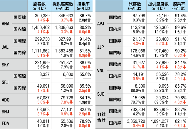 11社の発表値を合計すると、旅客数は国際線が前年同期比4.2%増の73万2804人で、国内線は0.4%減の335万9720人。提供座席数は国際線が2.9%増の82万5859席で、国内線は0.4%増の409万4237席となった。11社平均のロードファクター(座席利用率、L/F)は国際線が1.1ポイント上昇し88.7%、国内線は0.7ポイント低下し82.1%だった。