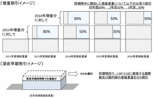 このほかに午前1時から午前5時59分までに着陸する国際線と国内線について、深夜早朝割引として着陸重量を50%割り引く。従来は貨物便のみだったが、旅客便にも拡大した。