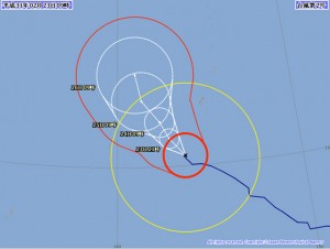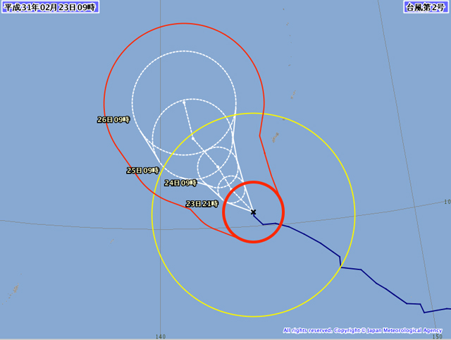 気象庁によると、強い台風2号は23日午前9時現在、マリアナ諸島付近を時速10キロの速さで北北西へ進んでいる。中心気圧は955ヘクトパスカル、中心付近の最大風速は40メートル、最大瞬間風速は60メートルで、中心から130キロ以内は風速25メートル以上の暴風域となっている。