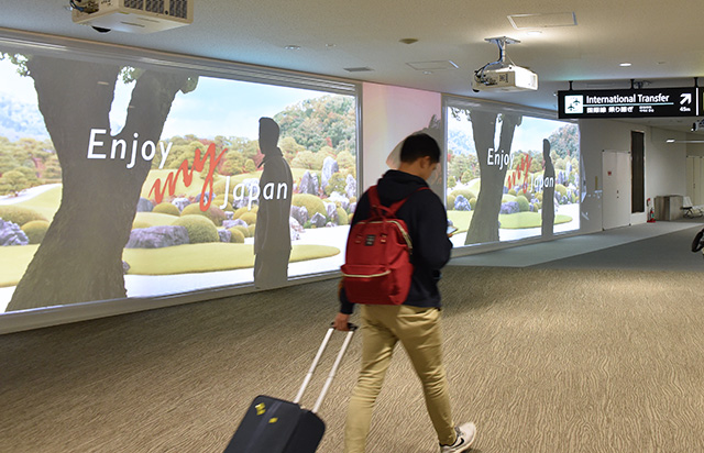 第1・第2ターミナルのコンコース9カ所で放映する。第1ターミナルは4カ所、第2ターミナルは5カ所を対象とし、到着コンコースの長い空間を活用して映像を流す。「自然」「観光」「文化」「食」をテーマとした動画で、外国人客が観光する様子を放映することで、到着客がイメージしやすいようにする。