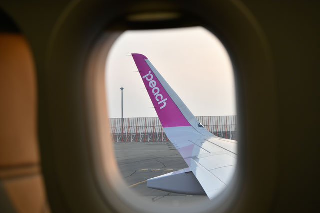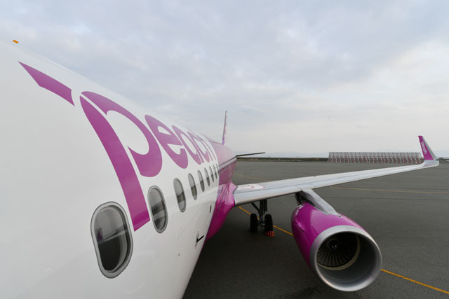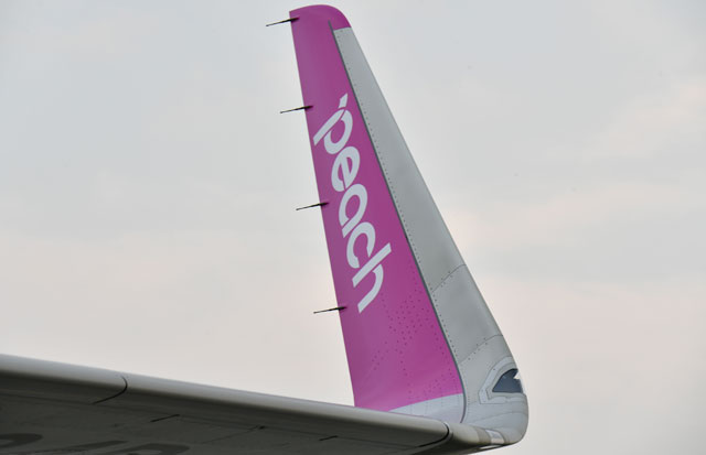 プレリクライニングシートを北東アジアで初採用し翼端にシャークレットを装備したピーチのA320 24号機=19年3月22日 PHOTO: Tadayuki YOSHIKAWA/Aviation Wire