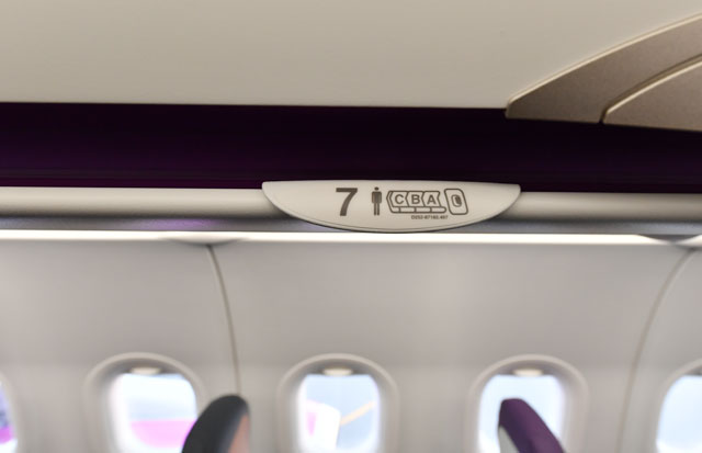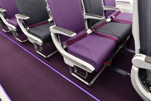 プレリクライニングシートを初採用したピーチのA320 24号機の機内に立つ客室乗務員=19年3月22日 PHOTO: Tadayuki YOSHIKAWA/Aviation Wire
