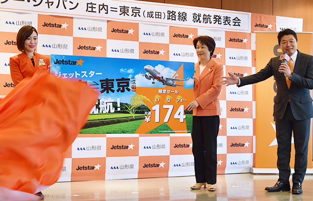 8月就航の成田-庄内線をアピールする(右から)ジェットスター・ジャパンの片岡社長、山形県の吉村知事、ジェットスターの客室乗務員=19年4月17日 PHOTO: Yusuke KOHASE/Aviation Wire
