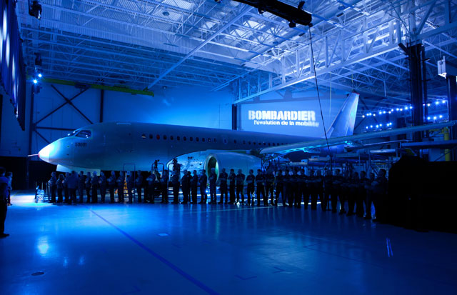 ケベック州ミラベル工場で公開されたCシリーズの飛行テスト用初号機(ボンバルディア提供)
