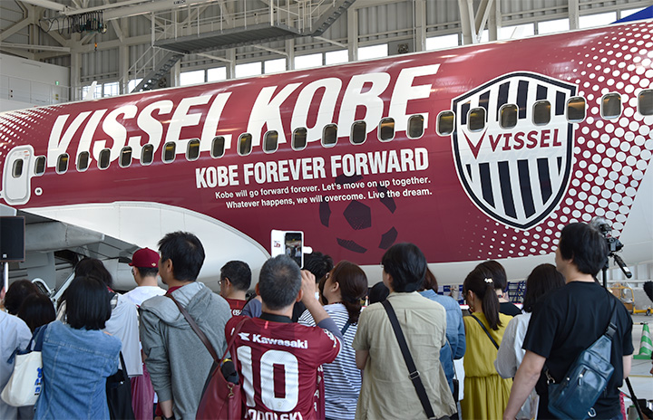 スカイマーク、ヴィッセル神戸デザイン機 格納庫にポドルスキら3選手