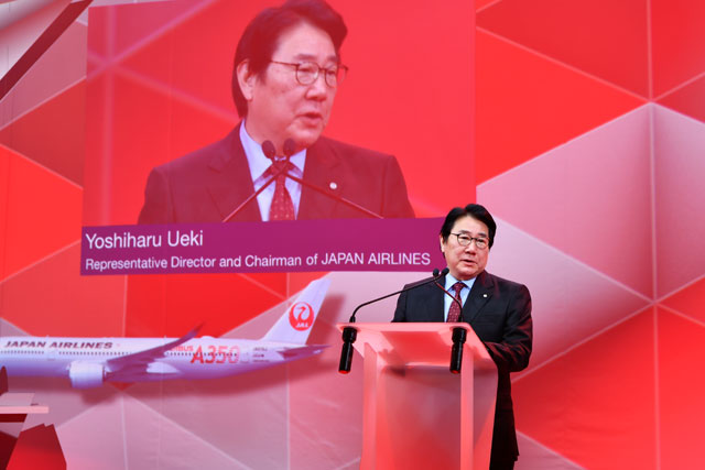 トゥールーズで開かれたA350の納入式典であいさつするJALの植木会長=19年6月13日 PHOTO: Tadayuki YOSHIKAWA/Aviation Wire