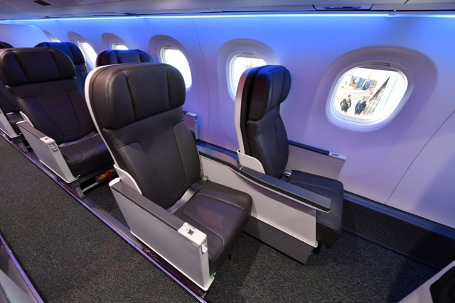 スタッガードシートを採用したエンブラエルE195-E2のビジネスクラス=19年7月16日 PHOTO: Tadayuki YOSHIKAWA/Aviation Wire