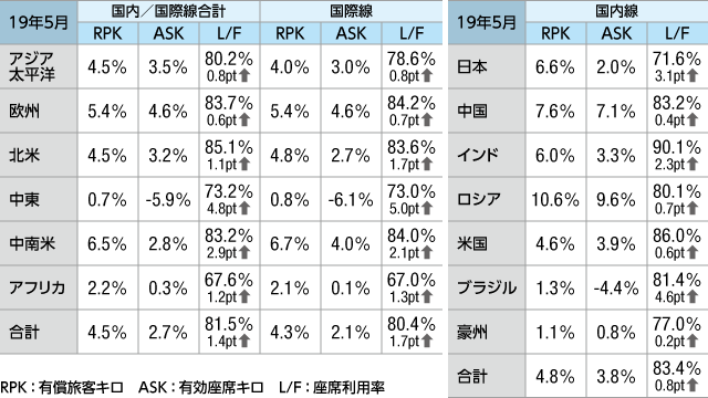 IATA(国際航空運送協会)の2019年5月の世界旅客輸送実績は、国際線と国内線の合計で、有償旅客の輸送距離を示すRPK(有償旅客キロ)は前年同月比4.5%増、座席供給量を示すASK(有効座席キロ)は2.7%増だった。ロードファクター(座席利用率、L/F)は1.4ポイント上昇し81.5%だった。