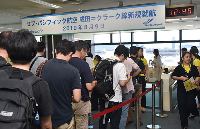 成田空港でセブパシフィック航空クラーク行き初便への搭乗手続きを進める利用客=19年8月9日 PHOTO: Yusuke KOHASE/Aviation Wire