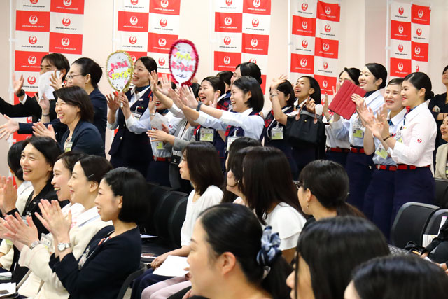 成田空港で開かれたJALのN-1グランプリで優勝し仲間の祝福を受ける宮里さん=19年9月4日 PHOTO: Masahiro SATO/Aviation Wire