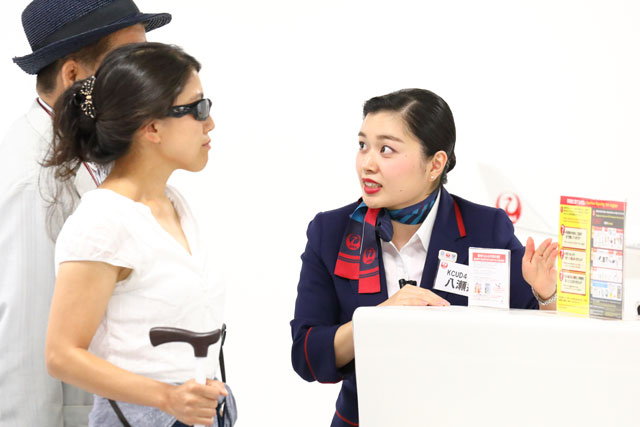 ロールプレイは、チェックインカウンターの接客を対象に、「またこの人に会いたい、またJALを利用したい」と感じられるサービスができているかを審査した。自動チェックイン機で手続き後、機械から出てきた受託手荷物のタグを手にして困っている様子の乗客や、白い杖を持った目の不自由な乗客など、4つの条件を設定。伝える内容がわかりやすくシンプルで、さらに話を広げられるかといった会話力が求められた。