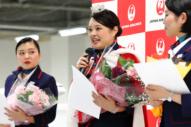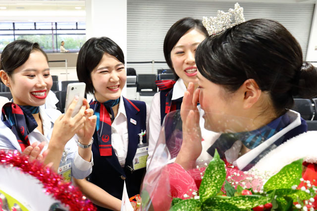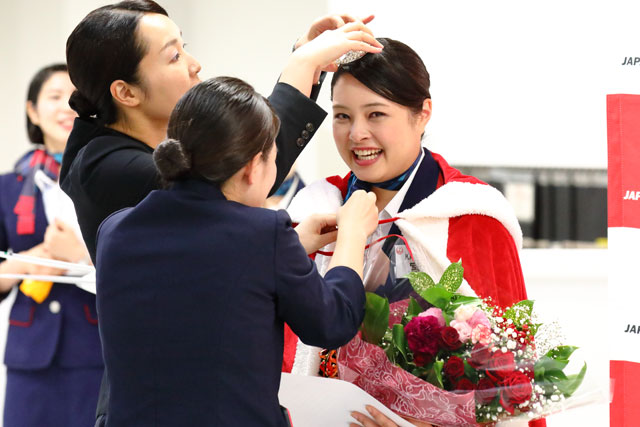成田空港で開かれたJALのN-1グランプリで優勝しティアラと花束が贈られた宮里さん=19年9月4日 PHOTO: Masahiro SATO/Aviation Wire