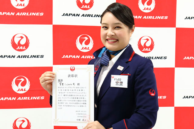成田空港で開かれたJALのN-1グランプリで優勝した宮里さん=19年9月4日 PHOTO: Masahiro SATO/Aviation Wire
