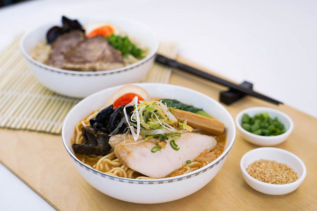 シンガポール航空がビジネスクラスで提供するけいすけロブスターラーメン(手前)と豚骨ラーメン(シンガポール航空提供)