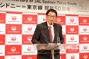 シドニー市内で開かれた日豪路線就航50周年パーティーであいさつするJALの豊島専務=19年9月30日 PHOTO: Masahiro SATO/Aviation Wire