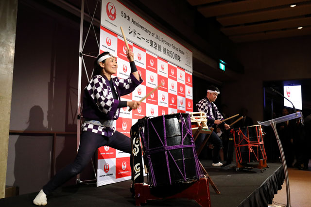 日豪路線就航50周年パーティーに招かれ太鼓を披露するシドニー在住の太鼓パフォーマー=19年9月30日 PHOTO: Masahiro SATO/Aviation Wire