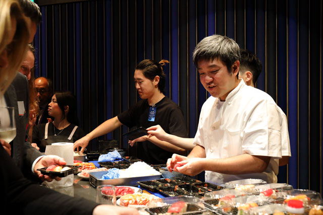 日豪路線就航50周年パーティーで来場者に振舞う寿司を握る寿司職人=19年9月30日 PHOTO: Masahiro SATO/Aviation Wire