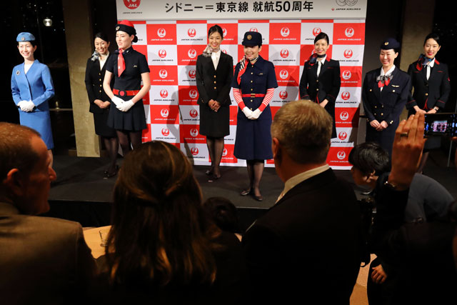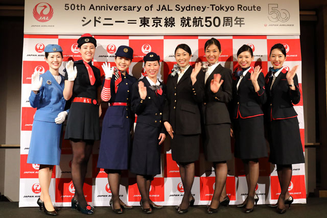 日本航空(JAL/JL、9201)は現地時間10月1日、東京-シドニー線就航50周年を迎えたシドニー国際空港で記念式典を開いた。搭乗口では、成田行きJL772便の乗客に搭乗証明書などの記念品が配られた。9月30日夜にはシドニー市内で日豪路線就航50周年パーティーが開かれ、JALのスタッフが歴代制服と来春から導入する新制服を披露した。また、シドニー線の羽田移管についても言及があった。