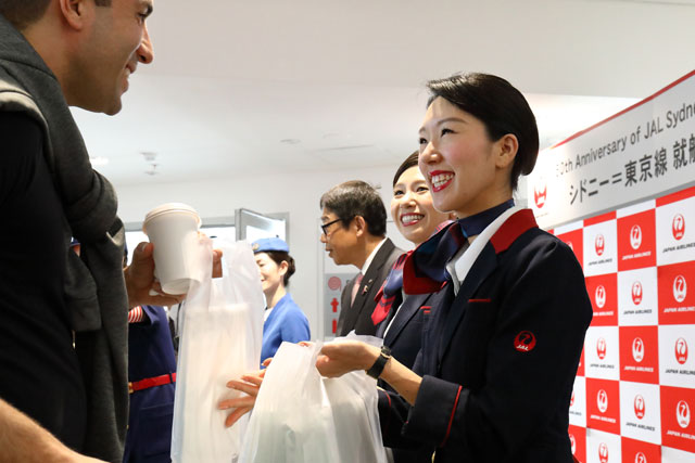 シドニー空港で成田行きJL772便の搭乗口で乗客に記念品を手渡すJALのスタッフ=19年10月1日 PHOTO: Masahiro SATO/Aviation Wire