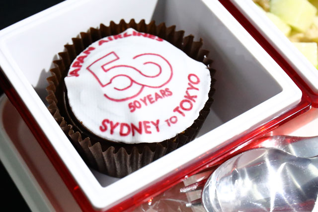 シドニー発成田行きJL772便エコノミークラスの2食目機内食で提供された記念デザート。約1カ月間提供する=19年10月1日 PHOTO: Masahiro SATO/Aviation Wire