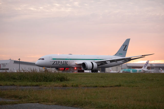 ZIPAIR(ジップエア)のボーイング787-8型機の初号機(登録記号JA822J)が10月27日早朝、成田空港に到着した。親会社の日本航空(JAL/JL、9201)からリース導入する機体で、塗装した中国・福建省南部の厦門(アモイ)から戻った。機内公開は12月になる見通し。
