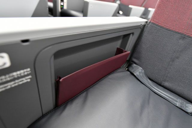 位置や角度が調整可能な新機構のレッグレストを導入。モニター下部の小物入れやポケットに加え、ひじ掛け下にもiPad miniを念頭に置いた収納スペースを設けた。また、折りたたみ式テーブルを出さなくてもドリンクを置けるよう、大型カクテルトレイを設け、個別の読書灯も備えた。