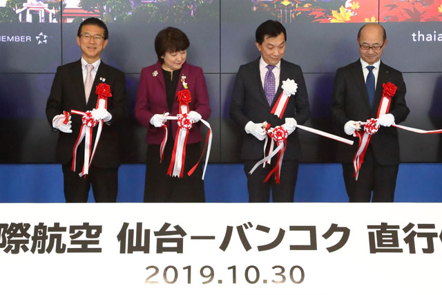 仙台空港で開かれた就航記念式典でテープカットするタイ国際航空のスメート社長(中央左)ら=19年10月30日 PHOTO: Masahiro SATO/Aviation Wire