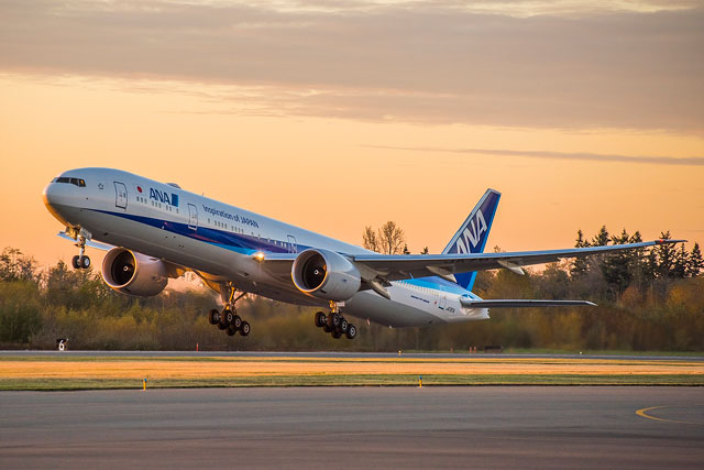 排ガス由来燃料でエバレットを離陸するANAの777-300ER(同社提供)