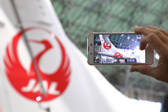 鹿児島空港にあるJACの格納庫でATR42をスマートフォンで撮影するツアー参加者=19年11月30日 PHOTO: Masahiro SATO/Aviation Wire