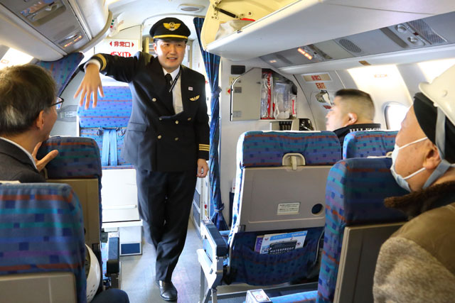 退役チャーターに使用されたJA8594の機内でツアー参加者に説明をするJACのパイロット=19年11月30日 PHOTO: Masahiro SATO/Aviation Wire
