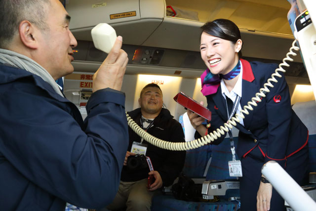 鹿児島行き退役チャーターJC2019便でアナウンスをする客室乗務員の追立さん=19年12月1日 PHOTO: Masahiro SATO/Aviation Wire