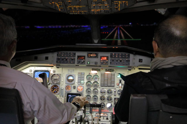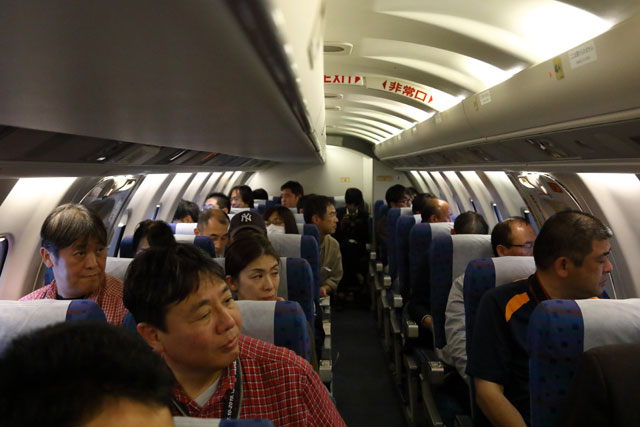 今回のチャーター便は、ただ徳之島を往復するだけでなく、鹿児島県内のサーブ就航空港を空から訪れる予定になっていた。前日のトークショーでは、いくつかの空港でローパス(滑走路上の低空通過)を実施予定と発表されており、参加者の期待は高まっていただろう。チャーター便のパイロットは廣枝丈人機長と與古光邦明副操縦士、客室乗務員は追立秀美さんが務めた。