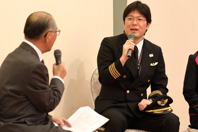 トークショーで酒井アナの質問に答えるJACの久保機長=19年11月30日 PHOTO: Masahiro SATO/Aviation Wire
