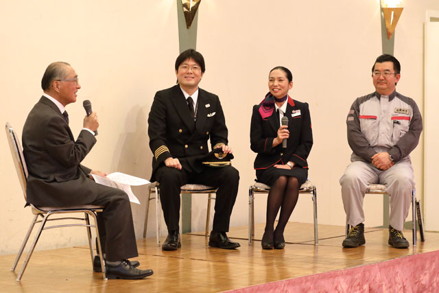 トークショーで久保機長らに質問する酒井アナ(左)=19年11月30日 PHOTO: Masahiro SATO/Aviation Wire
