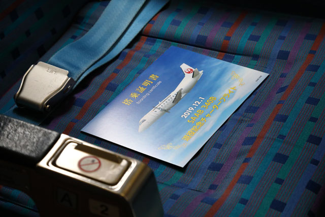 JA8594のシートに置かれていた搭乗証明書=19年12月1日 PHOTO: Masahiro SATO/Aviation Wire