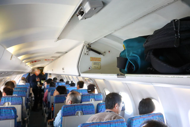 サーブ340Bの機内右側のみ設置されているオーバーヘッドビン=19年12月1日 PHOTO: Masahiro SATO/Aviation Wire