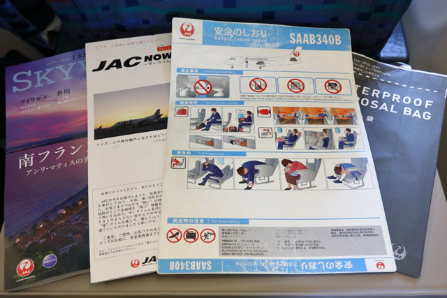 シートポケットに用意されていたサーブ340Bの安全のしおりとJALとJACの機内誌、エチケット袋=19年12月1日 PHOTO: Masahiro SATO/Aviation Wire