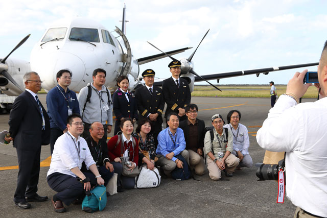 徳之島空港でJACのサーブ340Bと記念撮影するツアー参加者と乗務員ら=19年12月1日 PHOTO: Masahiro SATO/Aviation Wire